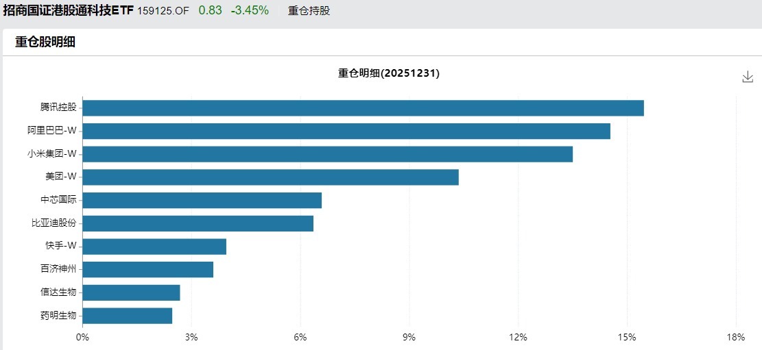 $招商国证港股通科技ETF(SZ159125)$跟踪国证港股通科技指数,最新规模6.37亿元。前五大权重为腾讯控股(15.31%)、阿里巴巴(14.39%)、小米集团(13.37%)、美团(10.26%)、中芯国际(6.52%),前十大权重合计占比78.75%。一手打包港股互联网巨头和硬科技龙头。