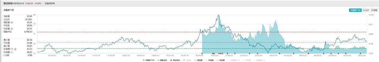 截至2月26日,恒生科技指数滚动市盈率约21.09倍,处于上市以来15.12%的历史分位。横向对比:创业板指43.49倍,科创50高达175.58倍,纳斯达克也在40倍以上。这种估值折价,反映的是市场对宏观环境、监管政策、流动性压力的过度悲观。