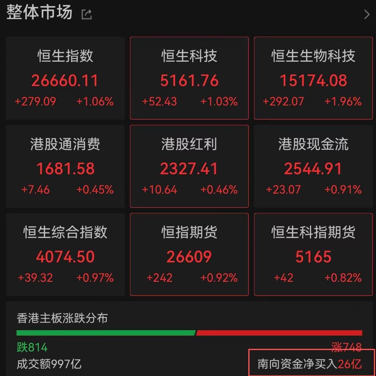 今天(2月27日)截至午盘,恒生指数涨1.06%报26656.49点,恒生科技指数涨0.97%报5159.46点,科网股普遍回暖——腾讯控股涨近3%,网易涨2.7%,美团涨超1.5%,阿里巴巴涨逾1%,哔哩哔哩涨近3%。半日成交额1218亿港元,市场情绪明显回暖。